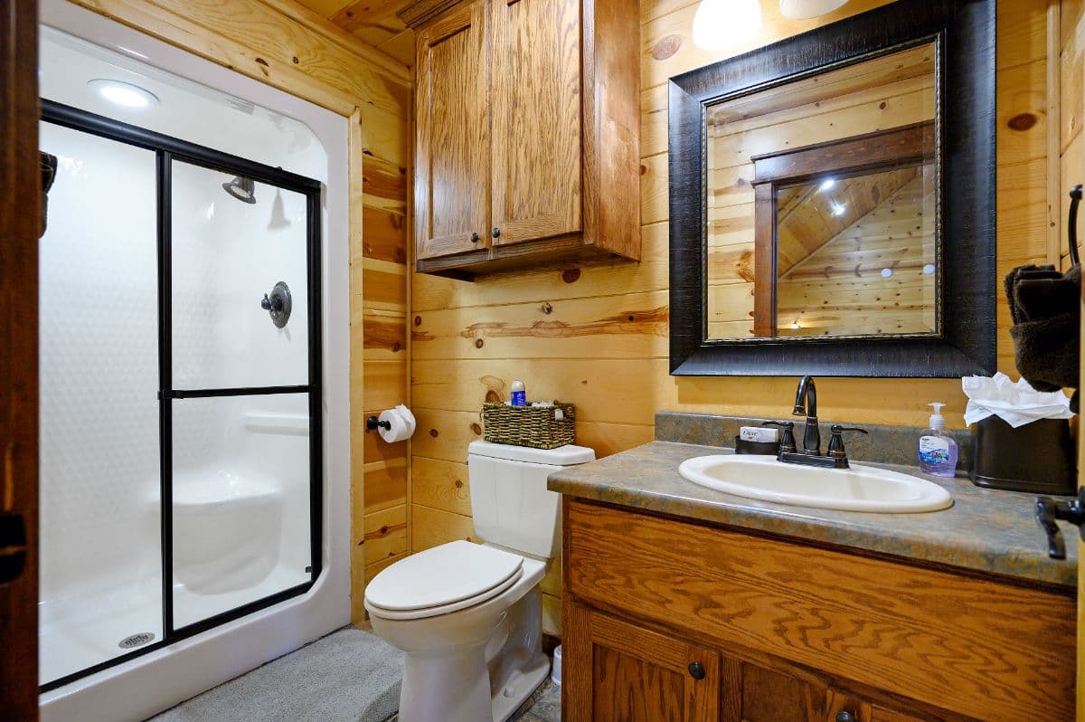 Inside Deerfield, you will find lodge-style furnishings meant for relaxation. In the Great Room, the 55-inch flat screen TV is perfect for watching the big game or watching a movie. If you prefer quiet time, just flip the switch on the beautiful 2-story rock gas fireplace and sit back and relax. Attractive hardwood floors and deer antler fixtures throughout the cabin are a perfect accent to the pine wood walls and soaring cathedral ceilings.