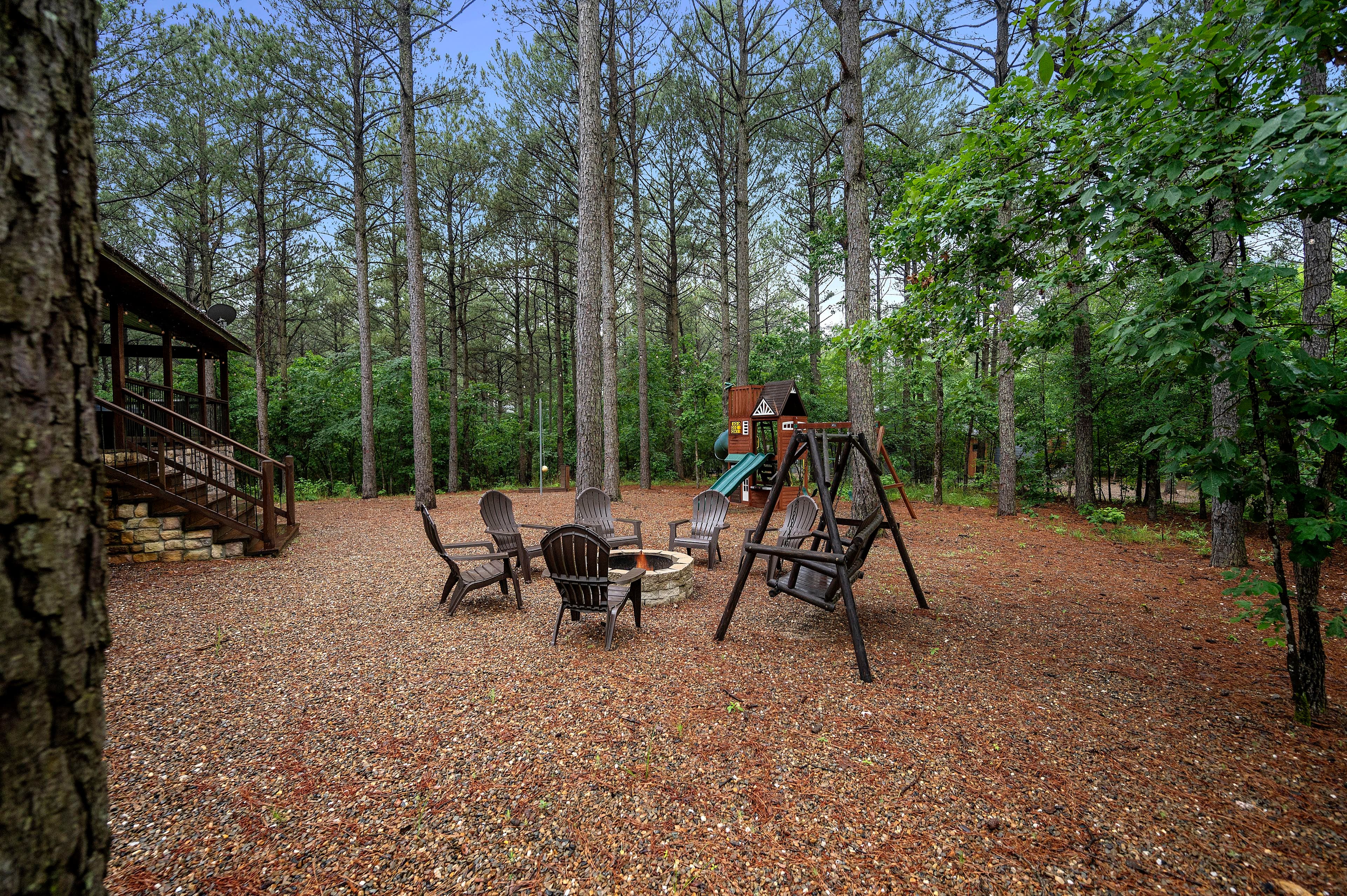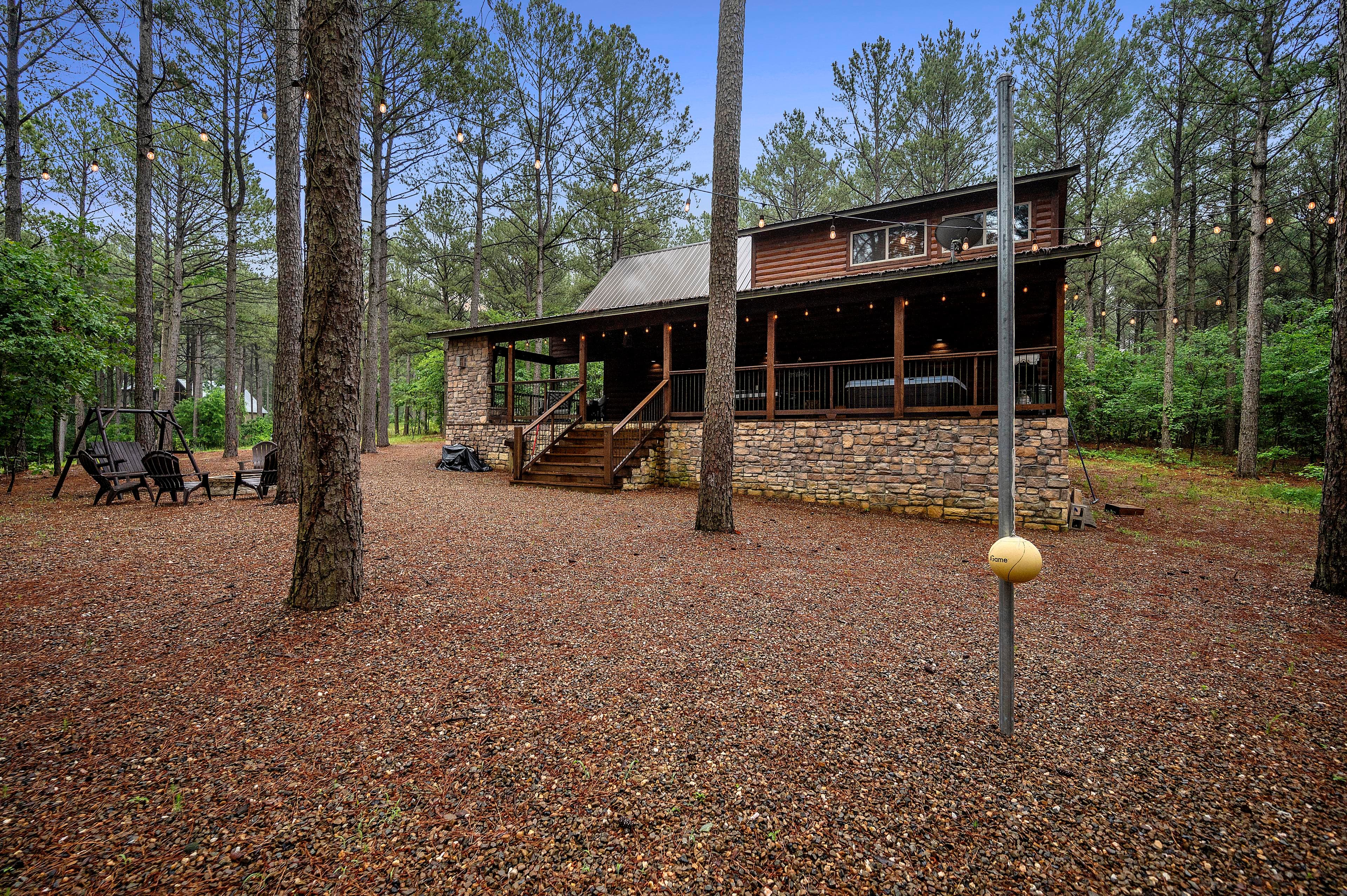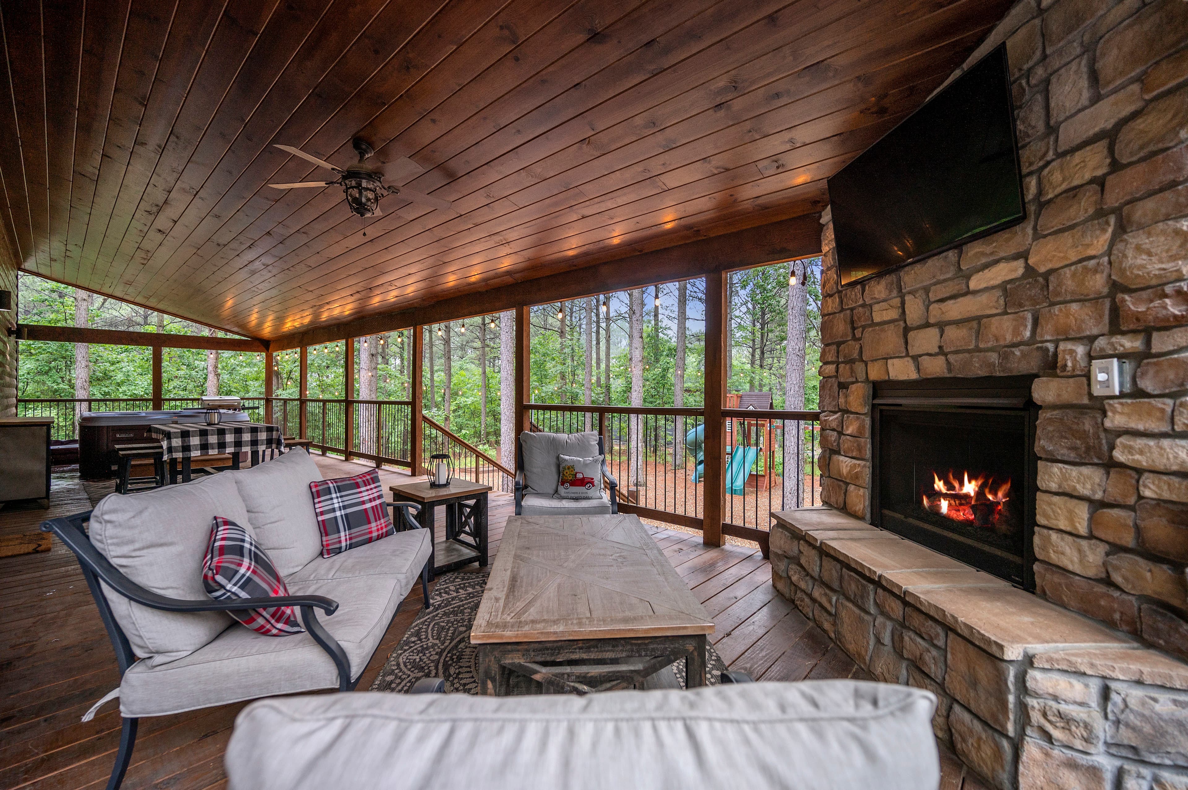 The outside of the cabin is loaded with amenities! LIVIN' WRIGHT sits on a large 1 & ½ acre lot with towering pine trees, and a large welcoming rocking chair porch. The deck wraps around the house and has multiple seating areas including a gas fireplace, Smart TV, comfy furniture, a dining area, a gas grill (propane provided), and a hot tub for up to 6 people to enjoy. Enjoy relaxing on the wrap-around deck and watch the kids play on the darling outdoor playground with a slide. Play a game of horseshoes or tetherball. At the end the day, you can all gather around the fire pit to roast marshmallows and tell Big Foot stories under a blanket of stars by the fire.