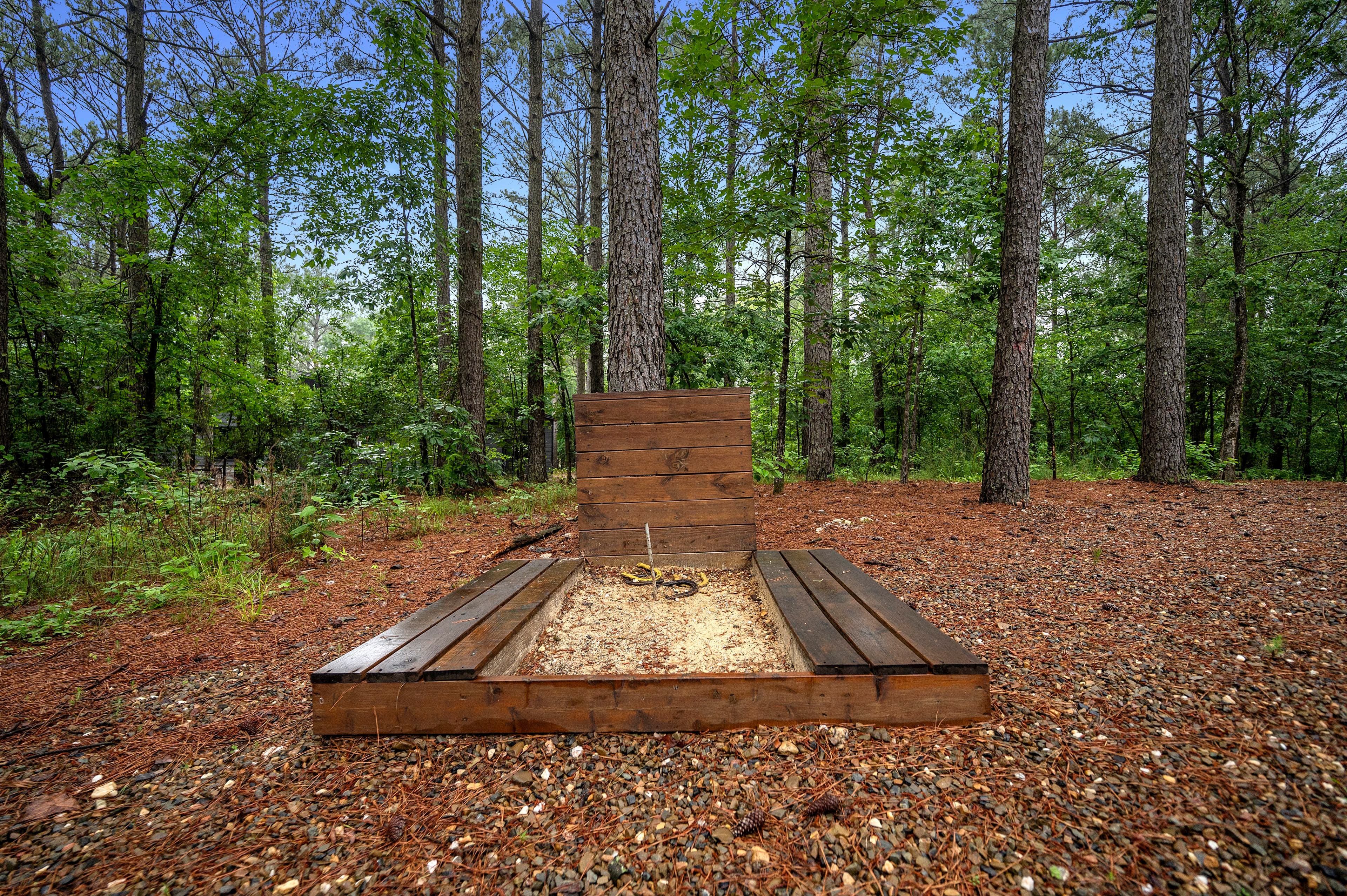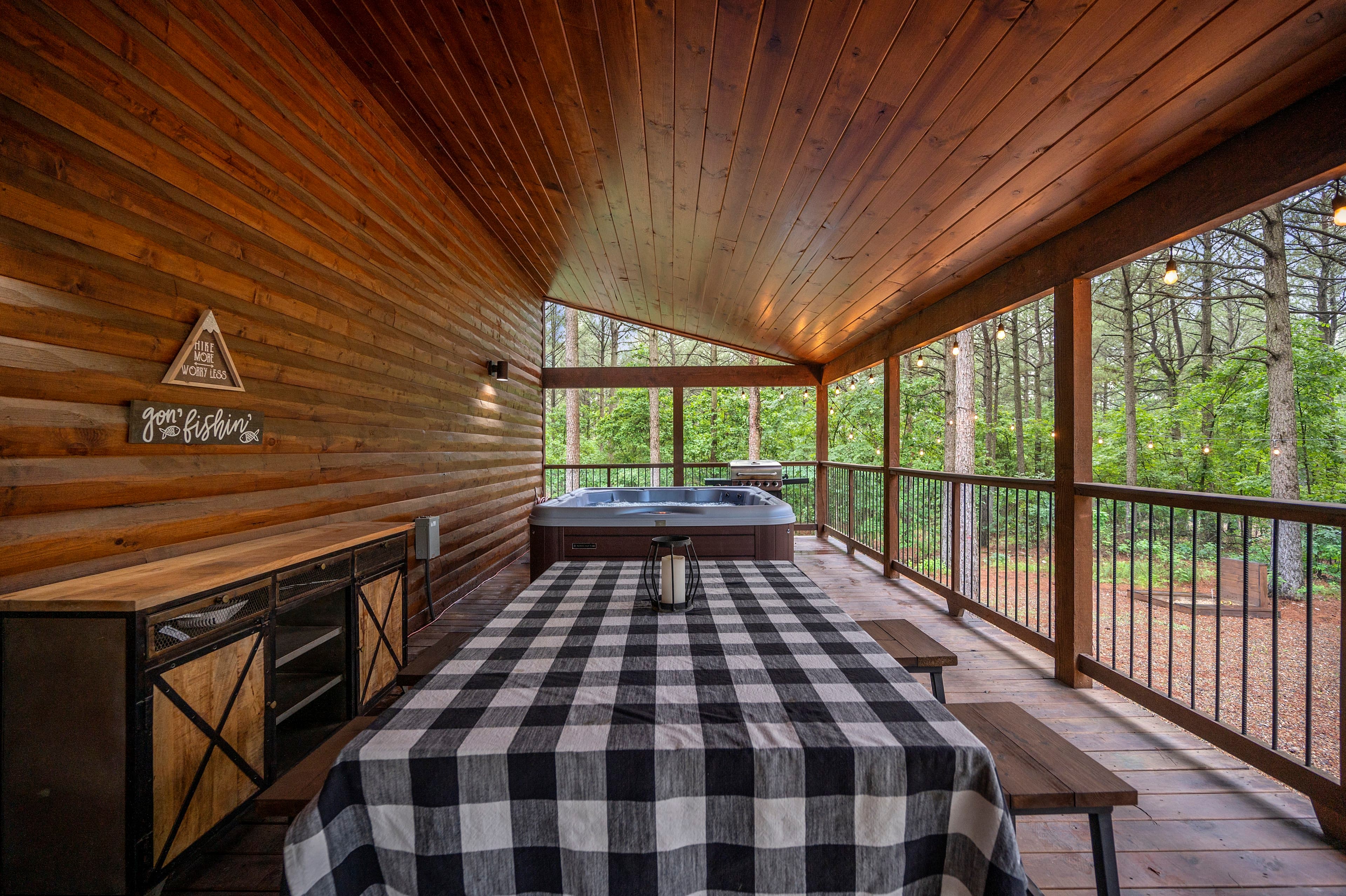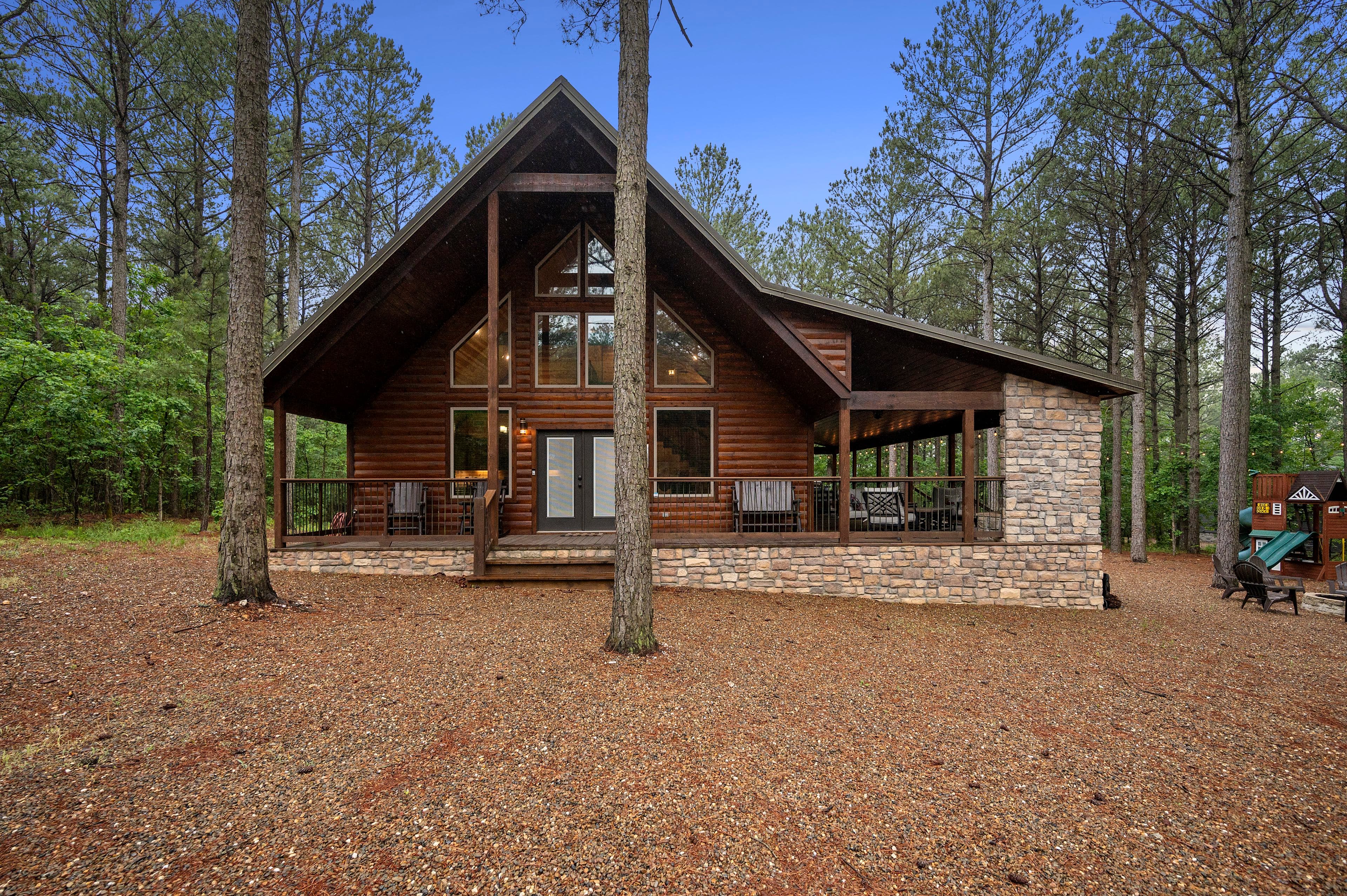 The outside of the cabin is loaded with amenities! LIVIN' WRIGHT sits on a large 1 & ½ acre lot with towering pine trees, and a large welcoming rocking chair porch. The deck wraps around the house and has multiple seating areas including a gas fireplace, Smart TV, comfy furniture, a dining area, a gas grill (propane provided), and a hot tub for up to 6 people to enjoy. Enjoy relaxing on the wrap-around deck and watch the kids play on the darling outdoor playground with a slide. Play a game of horseshoes or tetherball. At the end the day, you can all gather around the fire pit to roast marshmallows and tell Big Foot stories under a blanket of stars by the fire.