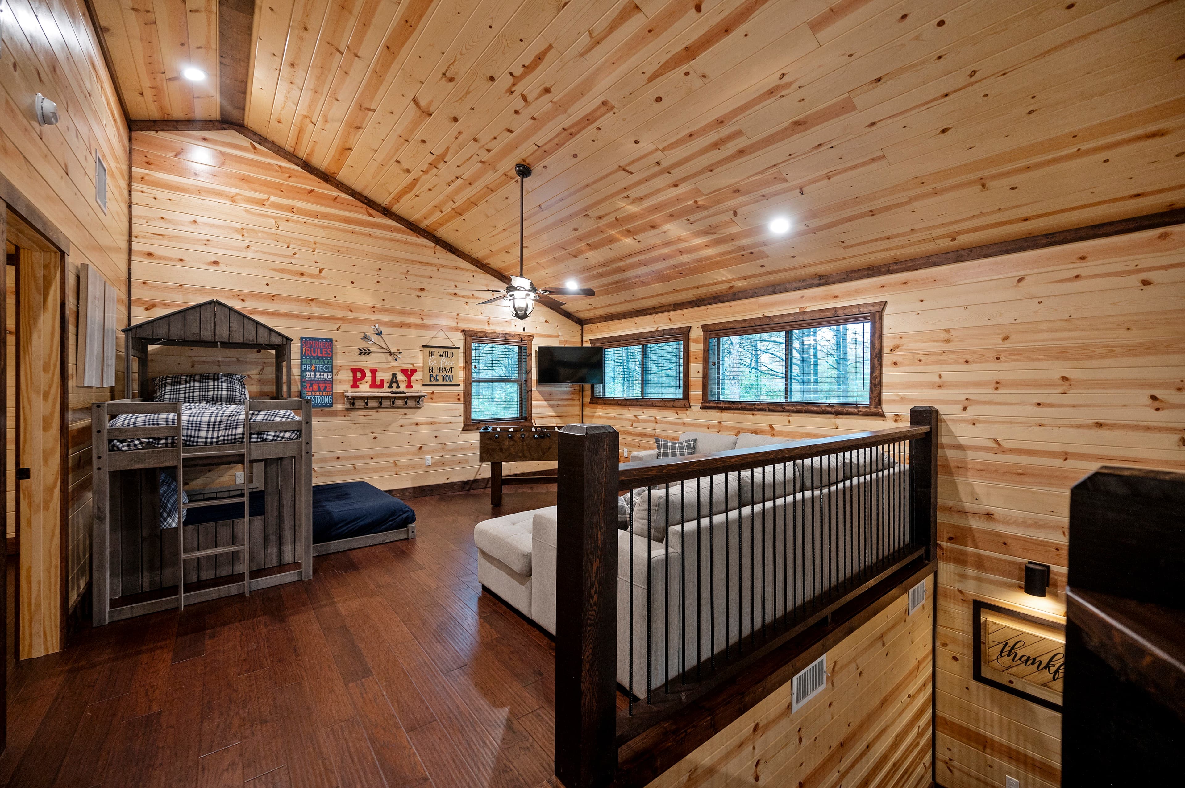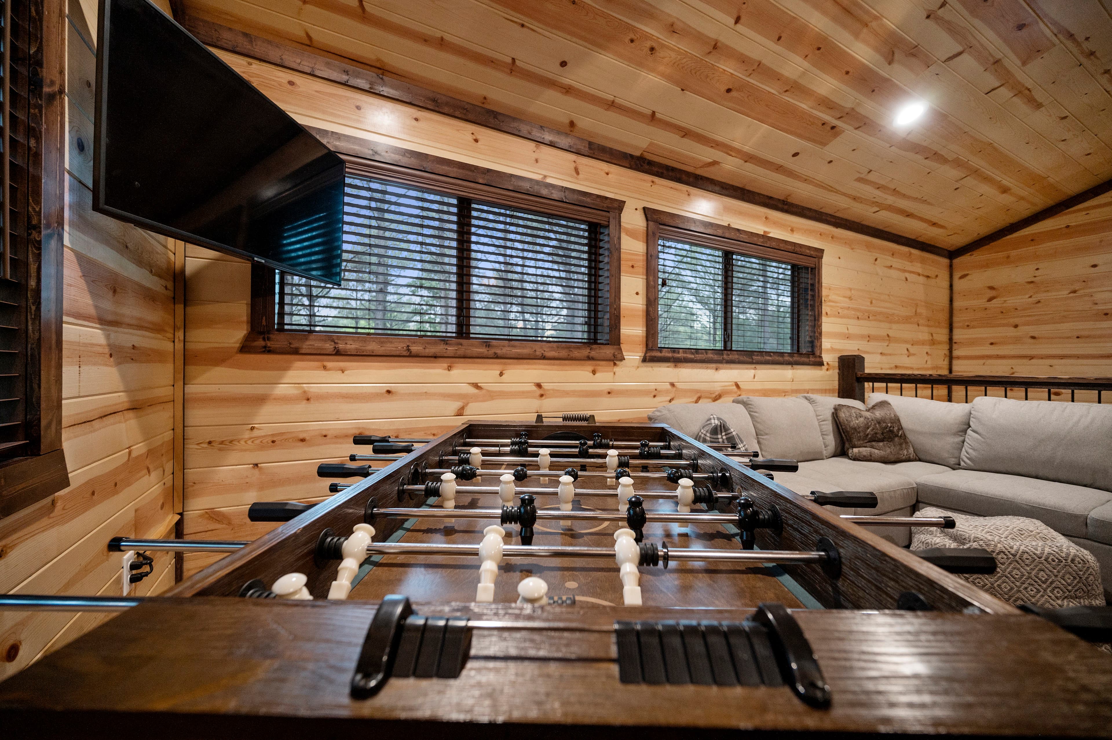 Upstairs - the loft is a large game room with a foosball table, Smart TV, bunk beds (twin over a full) and a large sectional sofa that pulls out to sleep more. Yes, this sleeper is comfortable for up to 2 small people. It's not your old-style sofa bed.