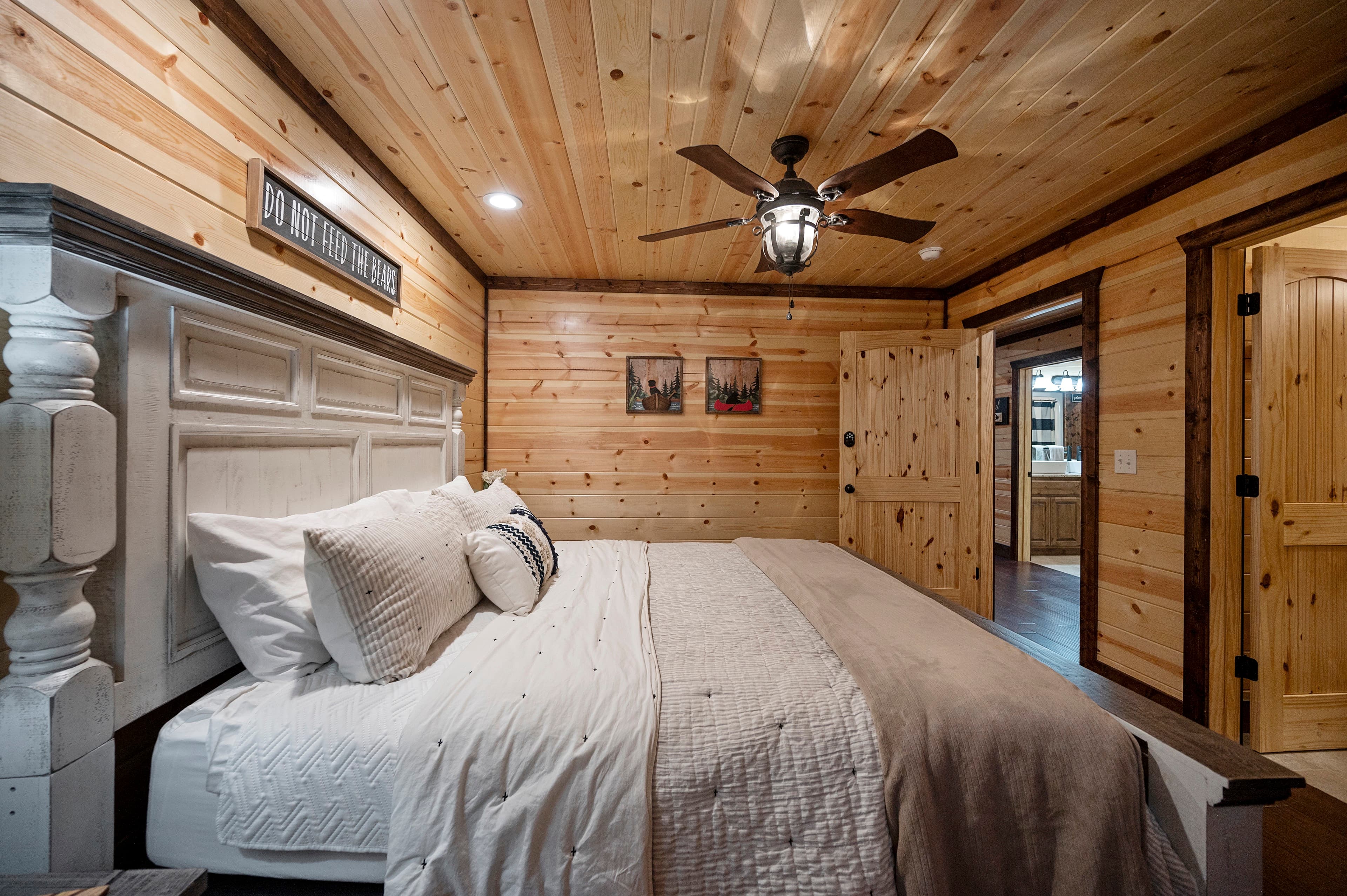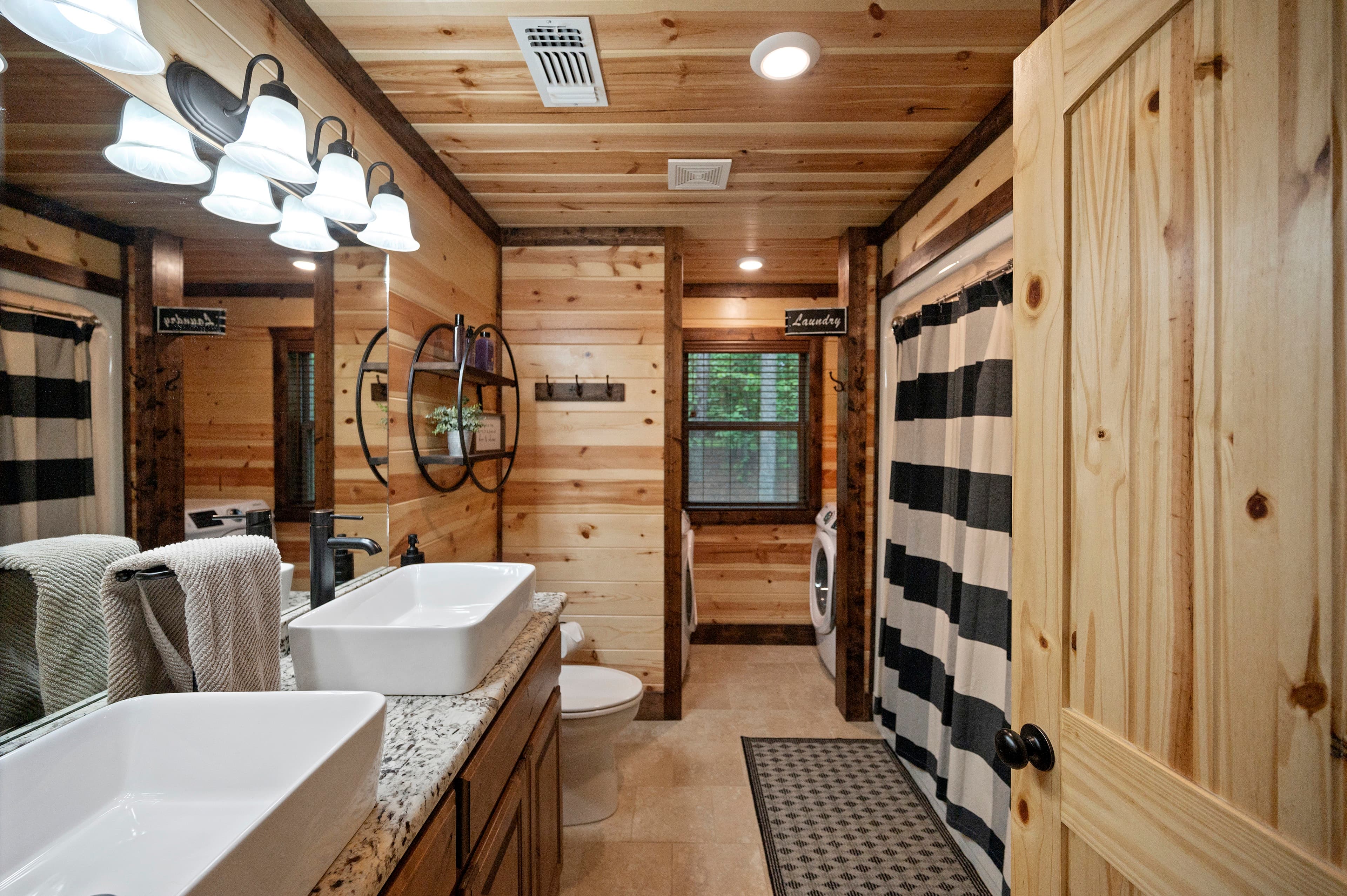 Two king bedrooms are downstairs, and a 3rd king bedroom is upstairs. Each bedroom offers a full bathroom, with an extra half-bath by the loft. All areas of the cabin - even outside - features a Smart TV. You even have your own laundry room, with a full-sized washer / dryer.
