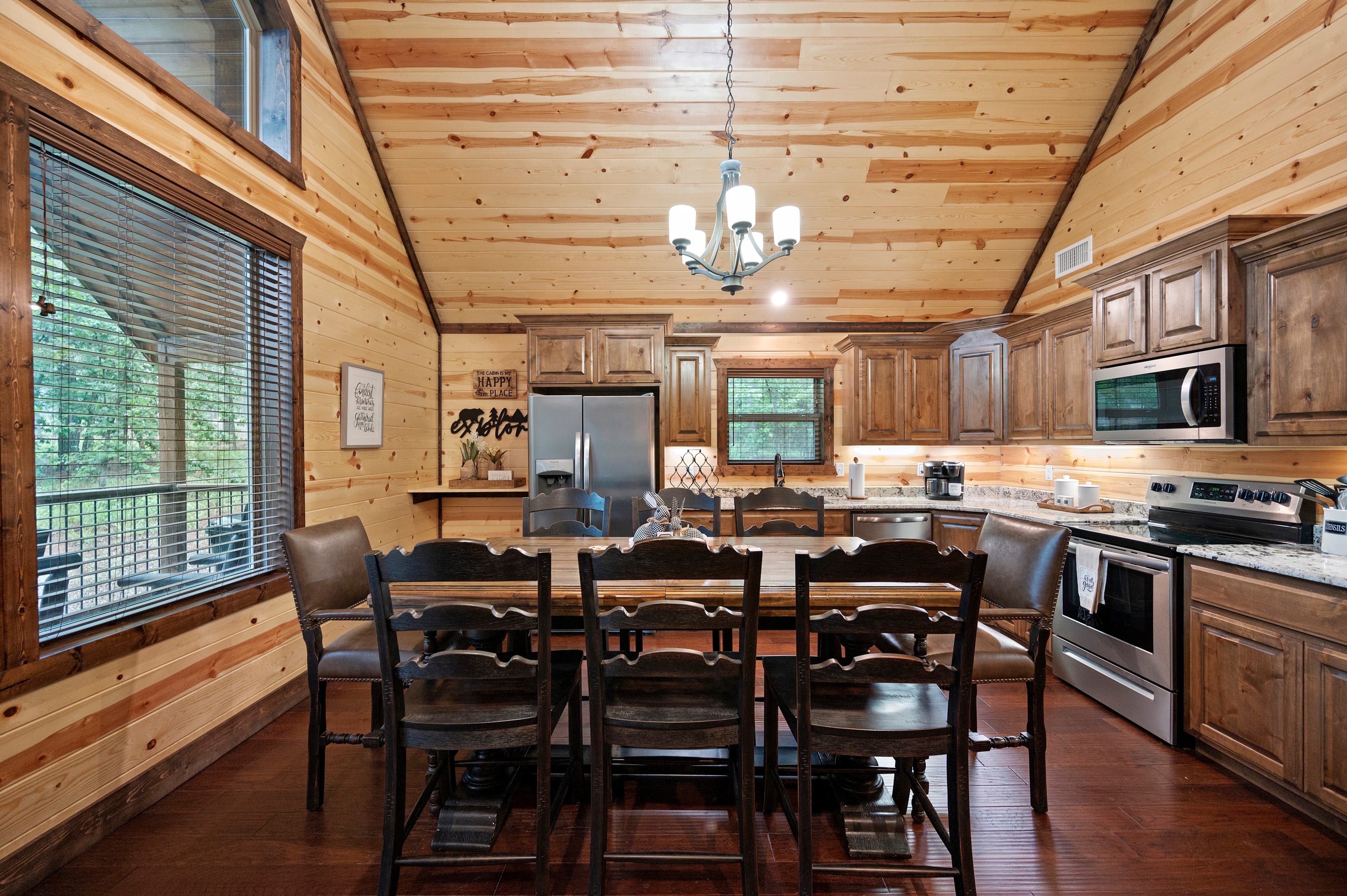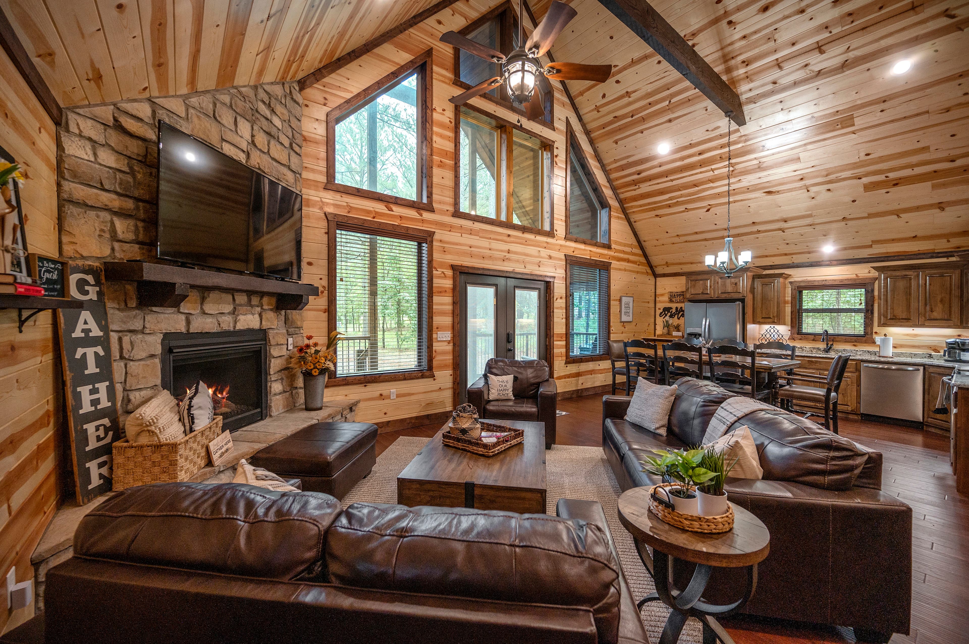 The focal point is the dramatic wall of windows, with soaring ceilings. There is an open, airy feeling you get - like you want to kick off your shoes, relax and enjoy your new surroundings inside the cabin, while surrounded outside by the tall pines of the Ouachita National Forest.