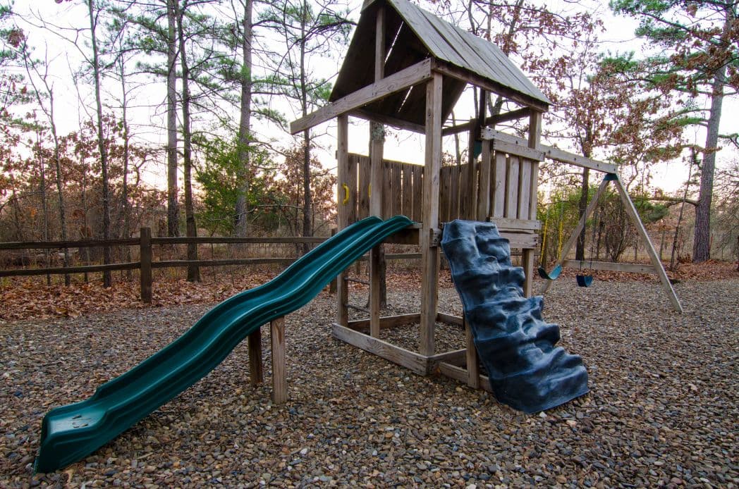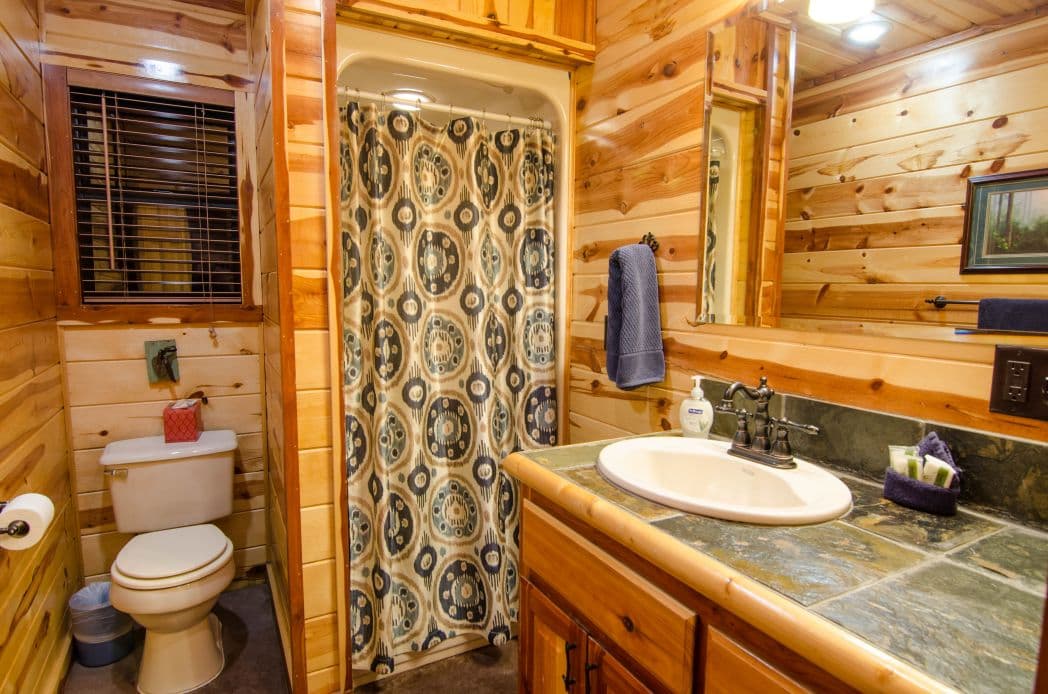 One unique feature of The M cabin is the ability to close off the 3/4 wrap around porch in order to create a mini fenced in yard! The patio furniture on the back porch is just as comfortable as the rocking chairs on the front so make sure you give them both a try. The back yard area of the cabin offers a playground set for children while you relax in the uncovered hot tub and enjoy your well deserved time out.